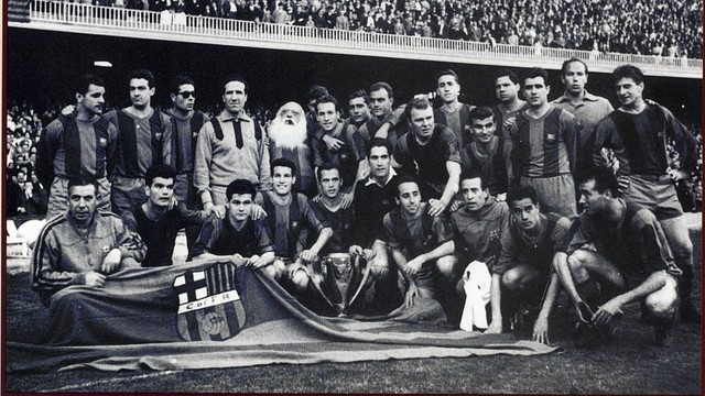 | 1958-59 liga celebrando con el trofeo en el Camp Nou |